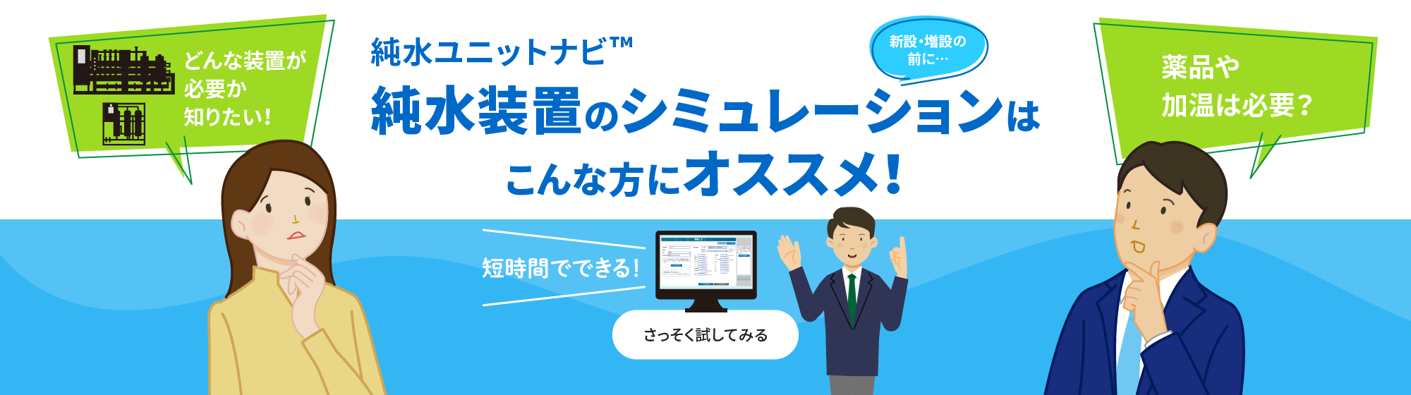 「純水ユニットナビ」は、水処理装置の導入をご検討されているお客様向けのシミュレーションツール提供サービスです。